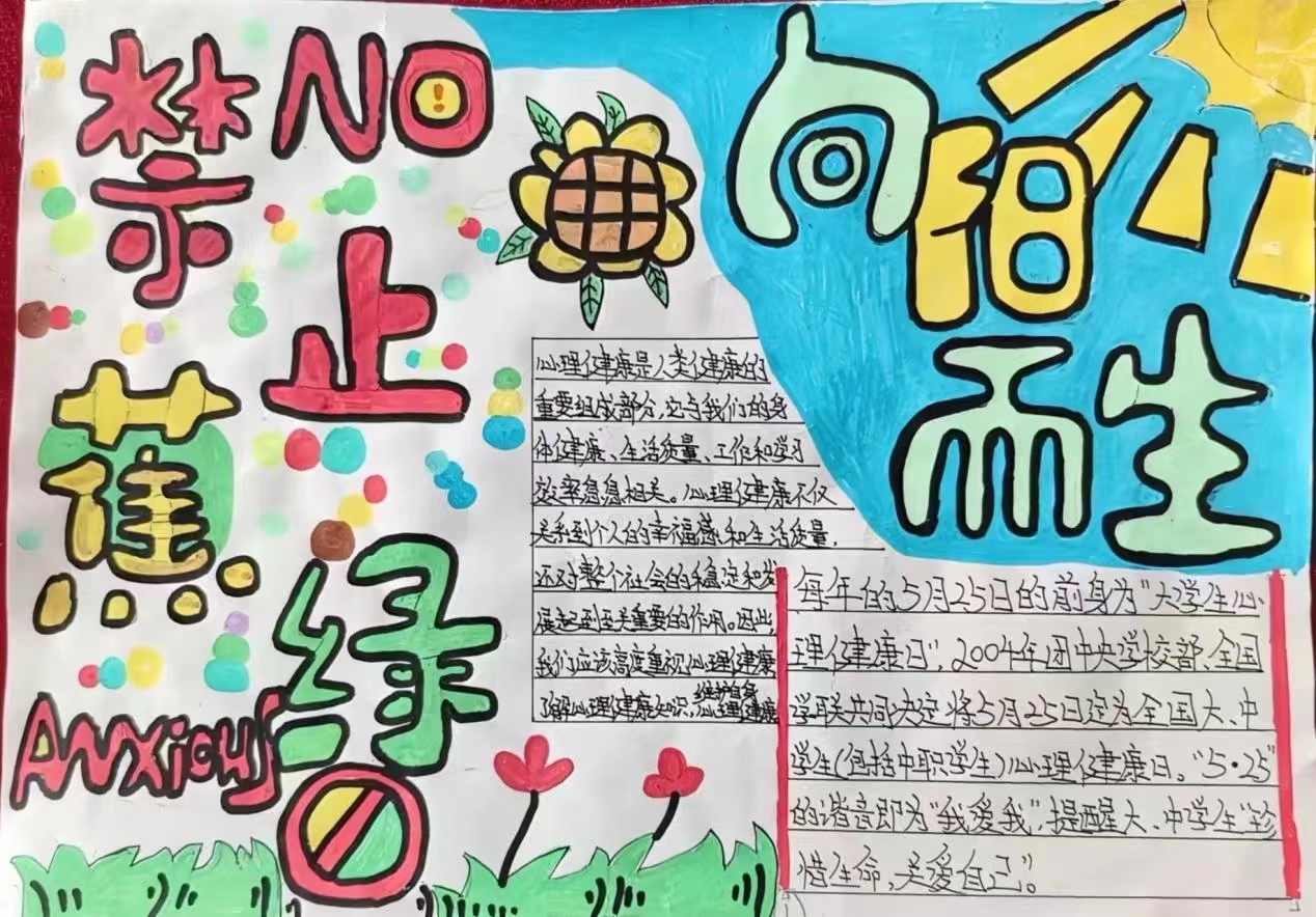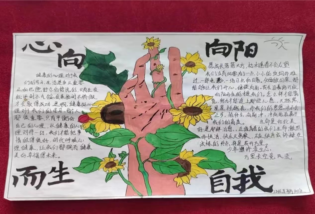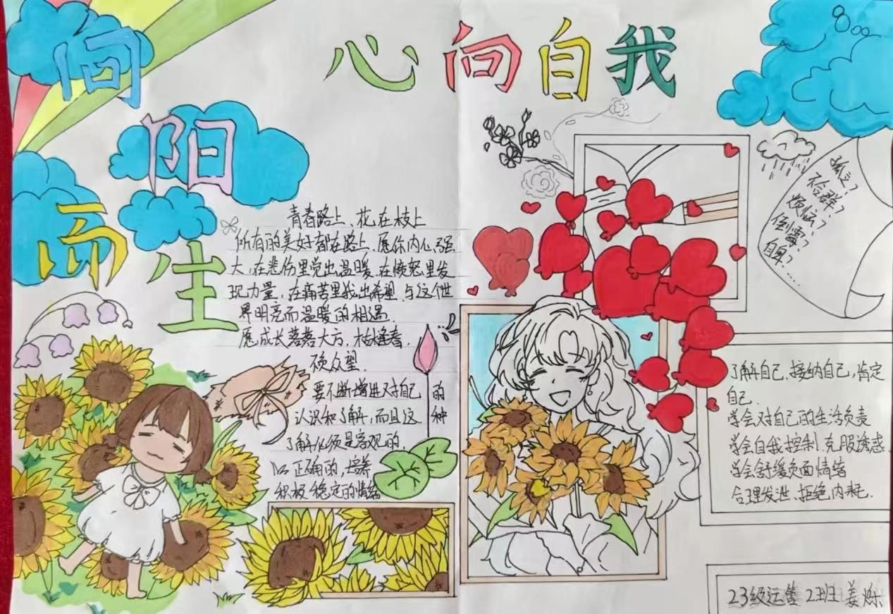 比赛吸引了来自不同学院的同学们的积极参与,参赛者们围绕“心向自我,向阳而生”这一主题,通过文字、绘画、拼贴等多种手法,表达了对自我成长、情绪管理、人际关系等方面的思考和见解。每一份主题鲜明、内容丰富的手抄报都是一个独立的故事,传递着积极向上的力量。