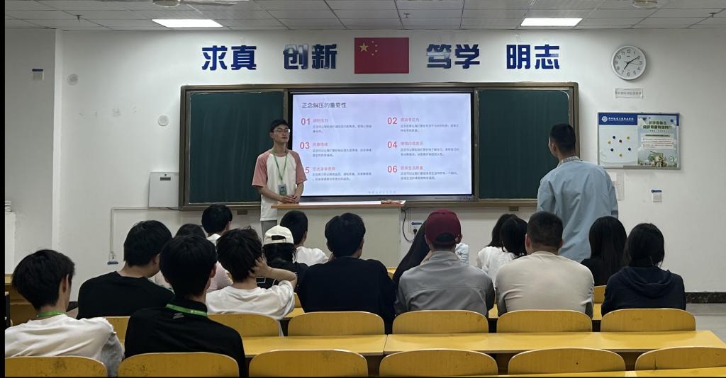 本次课程由韩丰灿为同学们介绍了焦虑情绪为何产生及其对身心健康的潜在危害,让同学们对焦虑有了更为清晰的认识。他指出正念是一种有意识地、不加评判地对当下时刻的觉察,通过将注意力集中在当下的体验上,可以更好地管理自己的情绪和压力。在理论讲解的基础上,还加入了丰富的实践内容。同学们一起进行了一系列正念练习,如正念呼吸、正念冥想等。在正念呼吸练习中,大家感受每一次吸气和呼气的过程,随着呼吸的节奏,逐渐放松身心,释放紧张和焦虑的情绪。